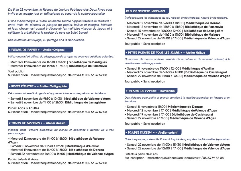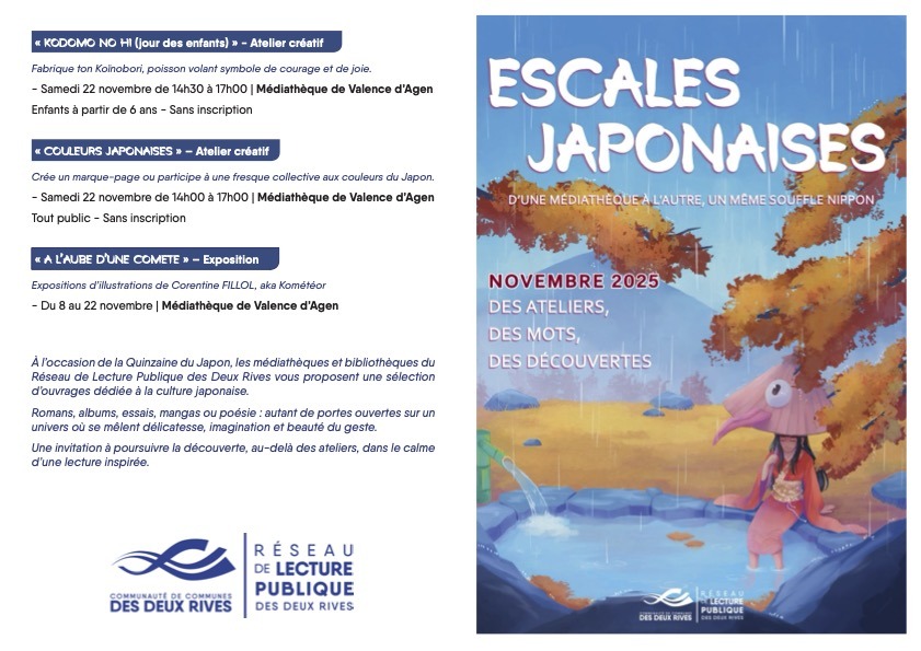 CC2R-Embarquez pour les « Escales Japonaises » dans vos médiathèques ! À l’occasion de la Quinzaine du Japon, le Réseau de Lecture Publique des Deux Rives est ravi de vous proposer un voyage culturel complet : « Escales Japonaises » ! Du 8 au 22 novembre 2025, découvrez la culture nipponne à travers des ateliers créatifs, une exposition et une sélection d’ouvrages inspirants.