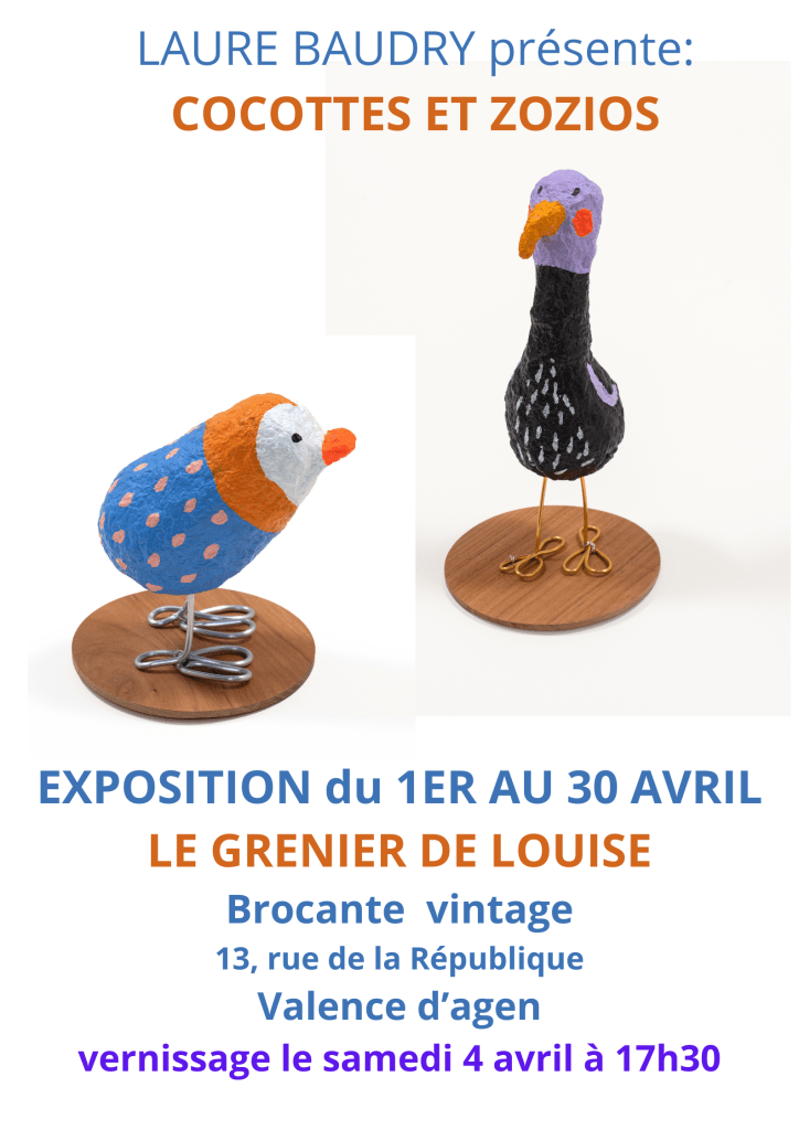 Laure Baudry a le plaisir de vous inviter à découvrir sa nouvelle exposition intitulée Cocottes et Zozios. Ces créations uniques seront présentées tout au long du mois d’avril dans un cadre authentique et chaleureux.