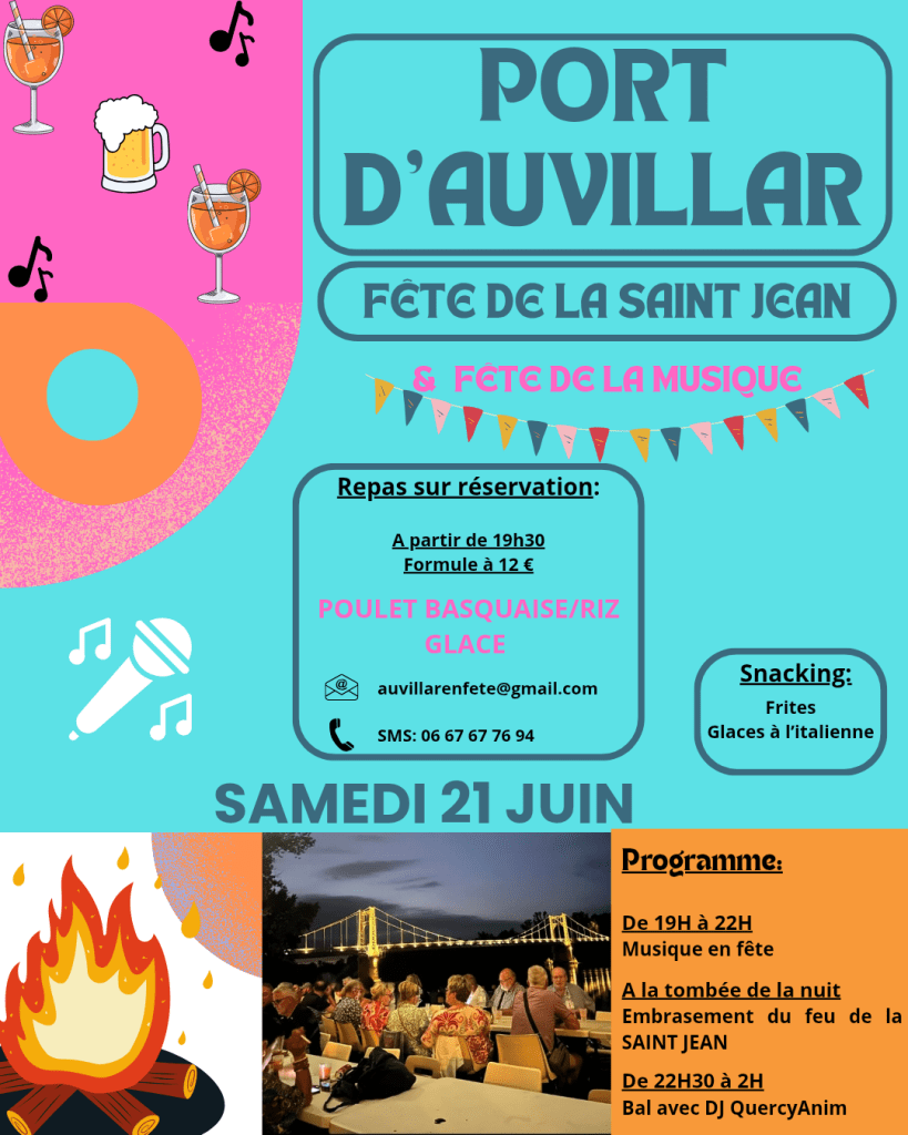 AUVILLAR 🎉 FÊTE DE LA SAINT-JEAN🎉 Préparez-vous pour une soirée mémorable au Port d’Auvillar le samedi 21 juin dès 19h ! La Fête de la Saint-Jean, une célébration conviviale et festive qui marquera le début de l’été.