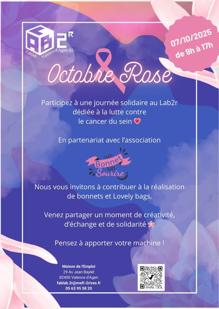 Le Fablab Lab2R (Valence d’Agen 82) se mobilise à l’occasion d’Octobre Rose et vous invite à une grande journée de solidarité et de créativité en partenariat avec l’association « Un Bonnet un Sourire ».