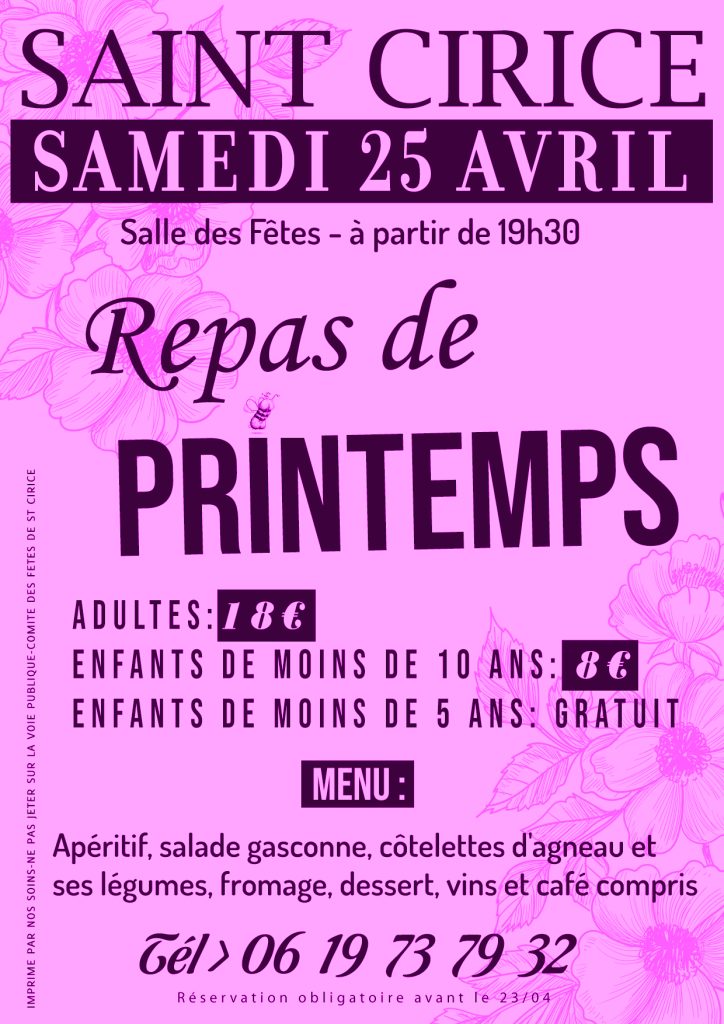 SAINT-CIRICE -Venez fêter le retour des beaux jours autour d’un repas de printemps convivial et chaleureux !